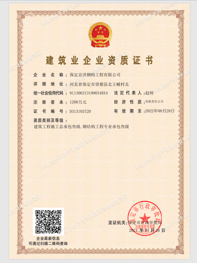 保定京洋鋼構工程有限公司位于千年古縣望都。望都縣處于京津冀核心區,是對接京津的交通要塞。距北京180公里,天津170公里,石家莊機場70公里。京石高鐵、京廣鐵路、京港澳高速、107國道四條交通大動脈縱貫全縣。圍繞望都南北各一座高鐵站,定州站(30公里)和保定站(35公里)。京昆高速、保阜高速均有連接線,四條省級公路縱橫交錯,交通便捷。